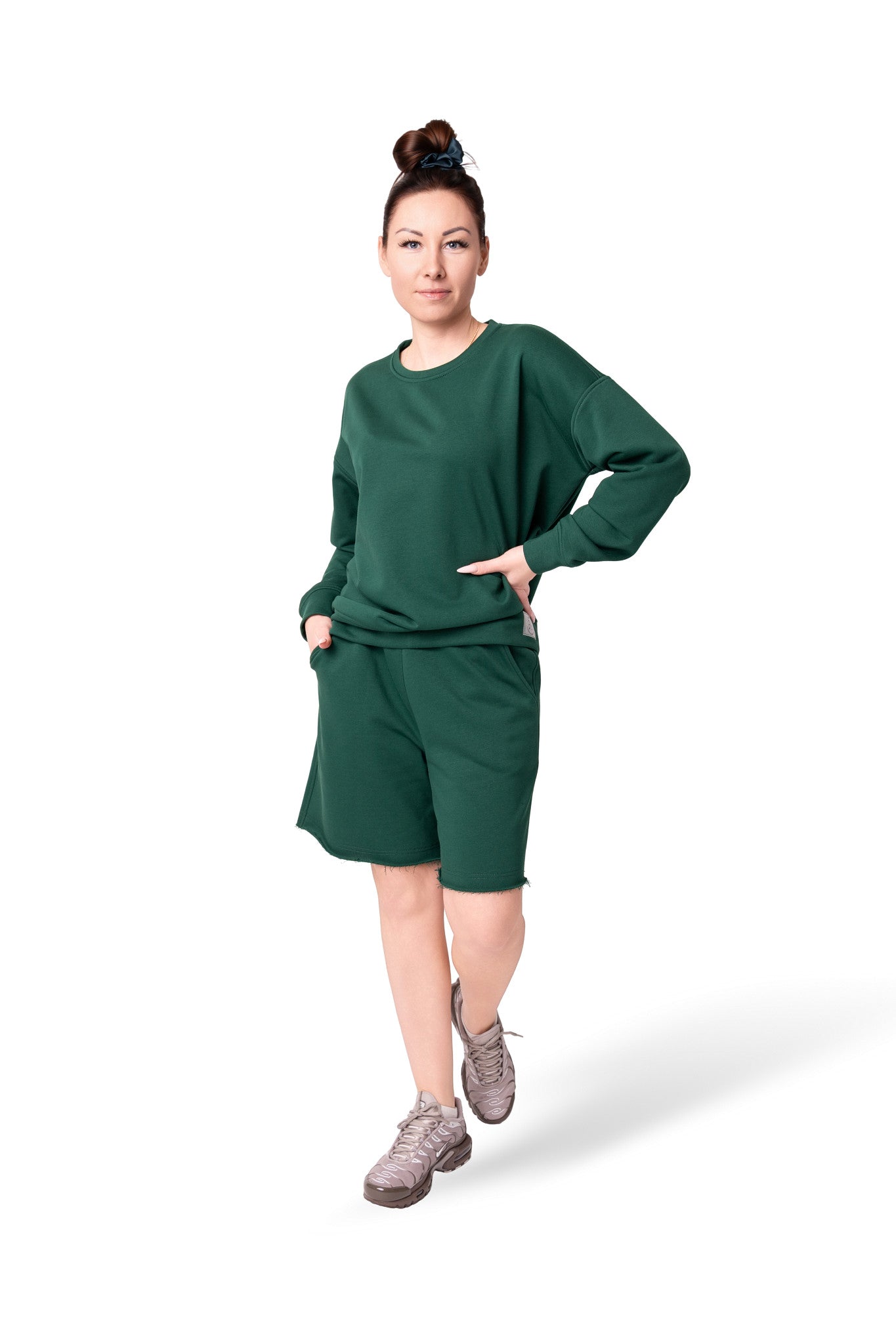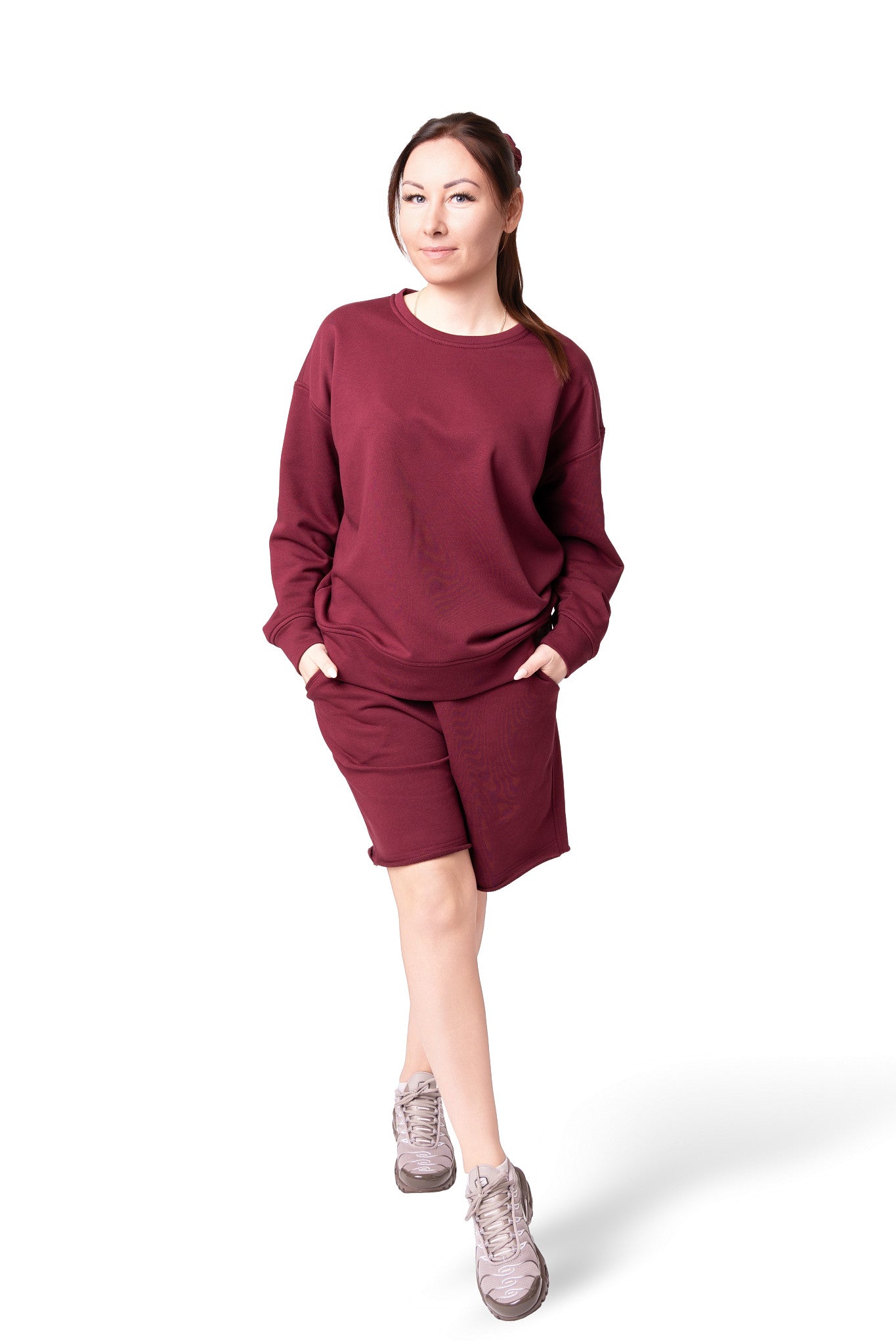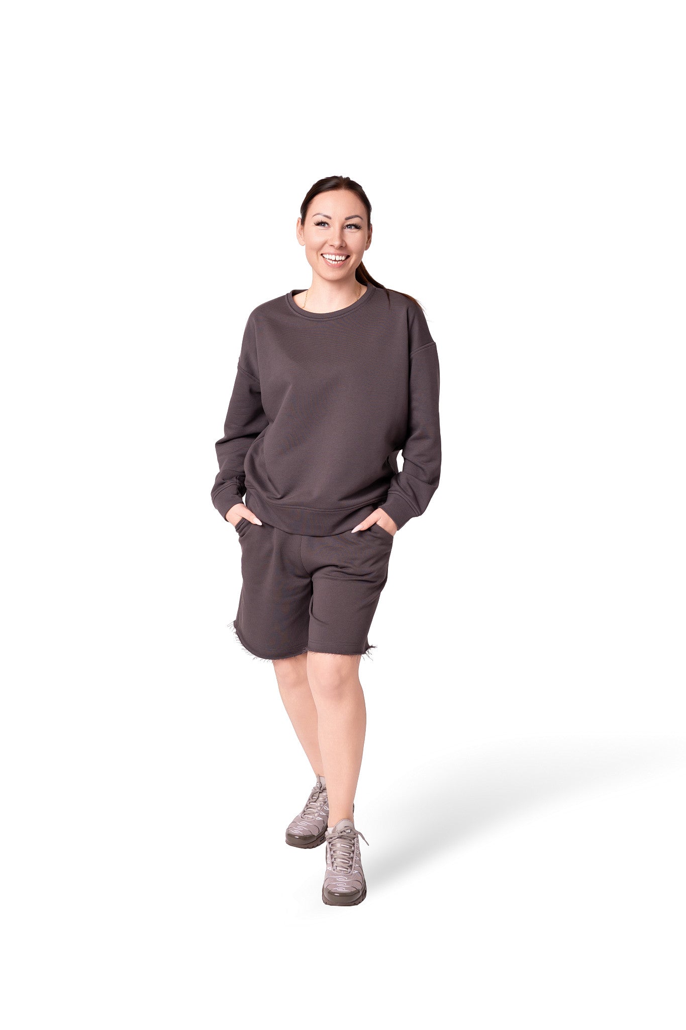 Kostiumėlis pasiūtas iš Penye trisiūlio trikotažo.Penye,tai aukštos kokybės audinys,gaunamas iš ilgų medvilnės pluoštų,kuriems atliekamas spec.apdorojimas-šlifavimas.Jo dėka iš pluoštų pašalinamas lengvas pūkas.Todėl šis trikotažas turi šiek tiek blizgesio,puikiai laiko formą,praktikai nesiglamžo ir yra anti-pilling(nesipumpuruoja).Jis Jums leis jaustis patogiai ištisus metus tiek mieste,tiek namuose.